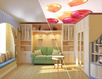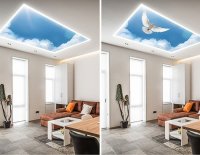 Во втором случае на потолке находится изначальный рисунок, а при включении подсветки проявляется дополнительное изображение, вносящее разнообразие и изюминку во внешний образ интерьера.