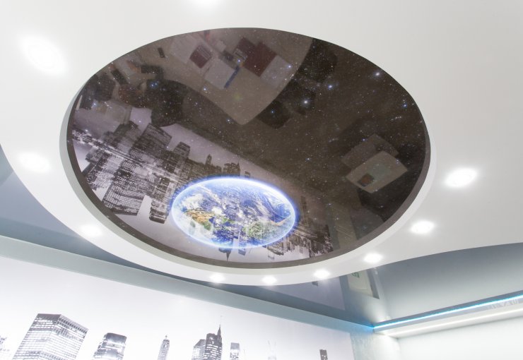 1. Фотопечать с подсветкой. На полотно наносится фотопечать звездного неба, галактик и планет. Под полотно крепится светодиодная лента, которая создает эффект свечения.